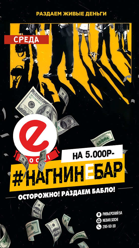 На одну ночь, небар превратится в отделение банка.и готов за ваши усилия и старания в битве с сотрудниками, обналичить порядочное колличество кэша. За каждое испытание участники битвы будут получать Е баллы, 300 баллов ты можешь получить еще до того, как придешь на вечеринку, просто напиши в комментарии к посту анонса вечеринки #ЯБУДУ . Приходи #НАГНИНЕБАР и забери главный приз 5 000 Еблей. 1 ебль =1 рубль