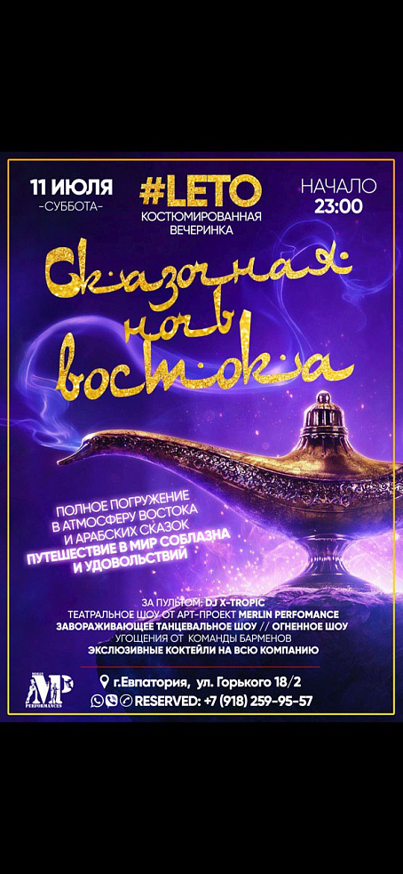 Полное погружение в атмосферу востока и арабских сказок, путешествие в мир соблазна и удовольствий.