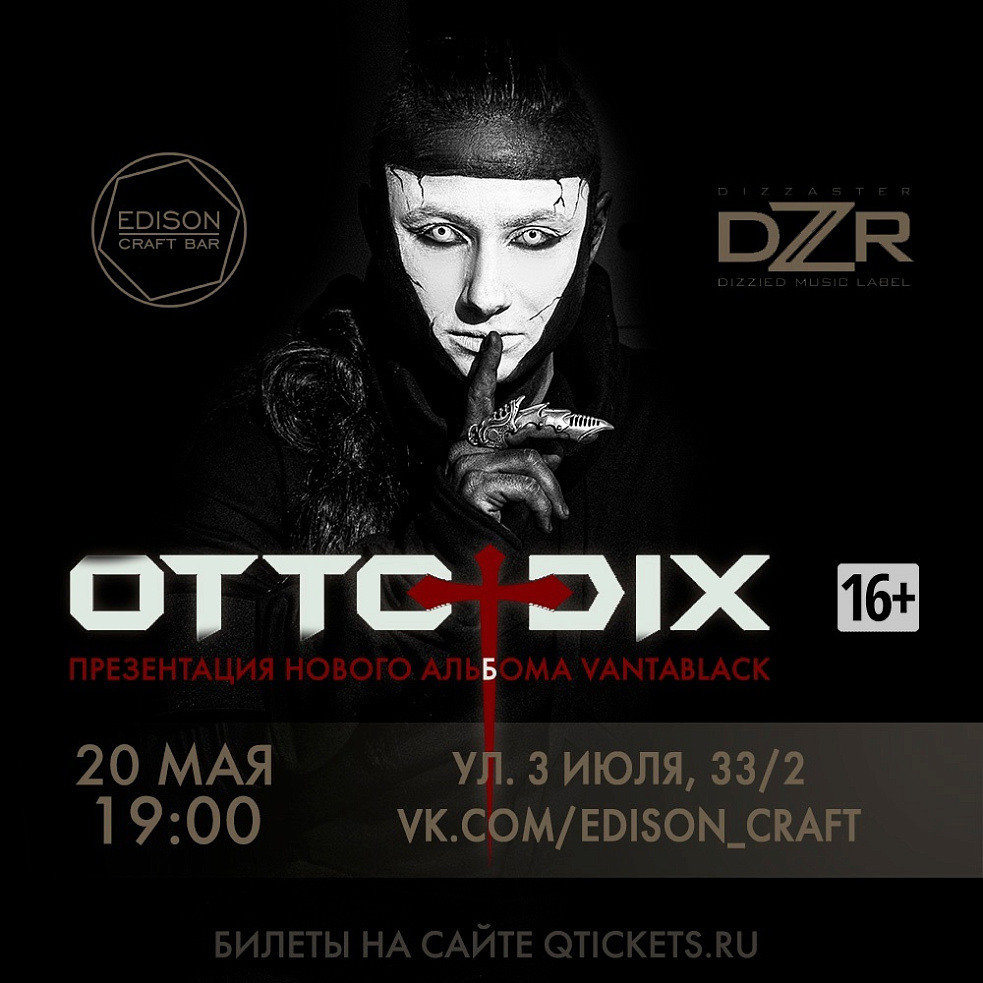 Окунись в таинственность темных волн! Легендарная группа снова в вашем городе с новым альбомом - "Vantablack"! Новый OTTO DIX - это мощь звукового экспрессионизма, окутанная лиричностью электронной виолончели. Vantablack - самое темное вещество на Земле. Почувствуйте абсолютную тьму и откройте для себя заново свет.
