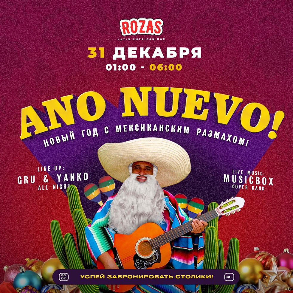Встретить Новый год с родными и близкими в узком семейном кругу под бой новогодних курантов - бесценно, а уже в 1 ночи Rozas Bar открывает двери и ждёт тебя с заключительной вечеринкой года под хиты от Gru / Yanko и песни наших резидентов MusicBox.