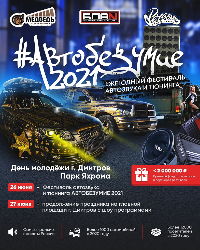 Мы рады сообщить, что 26 июня в рамках празднования Дня Молодежи в г. Дмитров пройдет ежегодный фестиваль автозвука и тюнинга "АВТОБЕЗУМИЕ 2021" и чемпионат России по БПАН