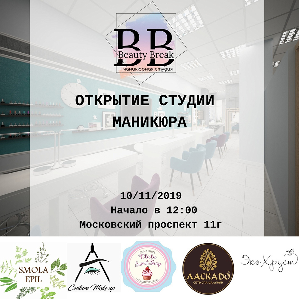 Мы открываем второй филиал студии Beauty Break по адресу Московский проспект 11г. Открытие состоится 10.11.2019. Вас ожидает фуршет и подарки для гостей студии! Подробная информация по тел 295-82-37.