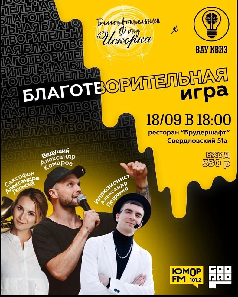 18.09 в стенах ресторана «Брудершафт» пройдёт БЛАГОТВОРИТЕЛЬНАЯ игра, все вырученные деньги с которой пойдут на нужды фонда «Искорка», который помогает деткам с онкологией.