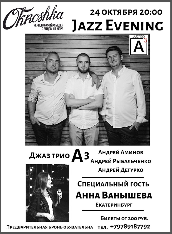 Мы приготовили для вас новый классный джазовый концерт! В этот четверг 24 октября на сцене Окрошки выступит Анна Ванышева, молодая джазовая вокалистка из Екатеринбурга в сопровождении нашего любимого Трио А3.