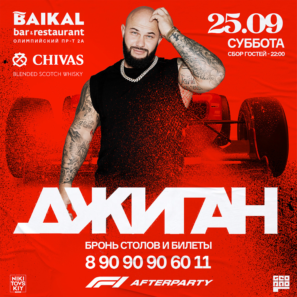 25 сентября сам Джиган выступит с эксклюзивным клубным концертом сразу после заездов Formula 1! Приглашаем всех на afterparty в самом сердце олимпийского парка — в субботу в рестобаре Baikal Джиган представит своё новое клубное шоу, а после продолжат наши Dj’s-резиденты до утра!