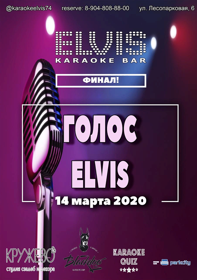 14 марта в караоке-баре Элвис состоится феерический финал конкурса "ГОЛОС ЭЛВИС". Лучшие певцы сойдутся в музыкальной дуэли и поборются за ценные призы от партнеров.