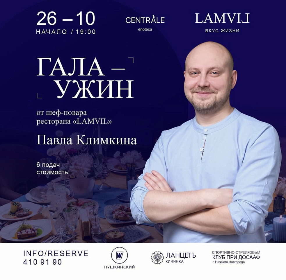 26 октября ресторан Lamvil приглашает вас на гала-ужин, в рамках которого пройдет презентация обновленного меню от шеф-повара - Павла Климкина!
