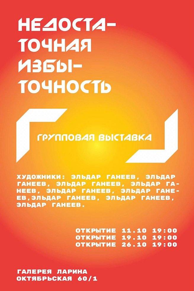 «Недостаточная избыточность» – групповая выставка. Но не спешите искать на афише разные имена. В этом проекте Эльдар Ганеев объединяется не с другими художниками, а с собственным искусством, настолько разноплановым, что рассматривать его как творчество одного человека – значит обречь себя на бессмысленные блуждания в поисках только одного выхода в лабиринте, где этих выходов десяток. Создавая «внутренних» художников, Ганеев позволяет каждому свободно действовать в рамках своей системы координат и творческих предпочтений, при необходимости объединяя их в арт-группу. Так и получилось, что в «Галерее Ларина» будут выставляться Эльдар Ганеев, Эльдар Ганеев, Эльдар Ганеев, Эльдар Ганеев, Эльдар Ганеев, Эльдар Ганеев, Эльдар Ганеев, Эльдар Ганеев, Эльдар Ганеев.