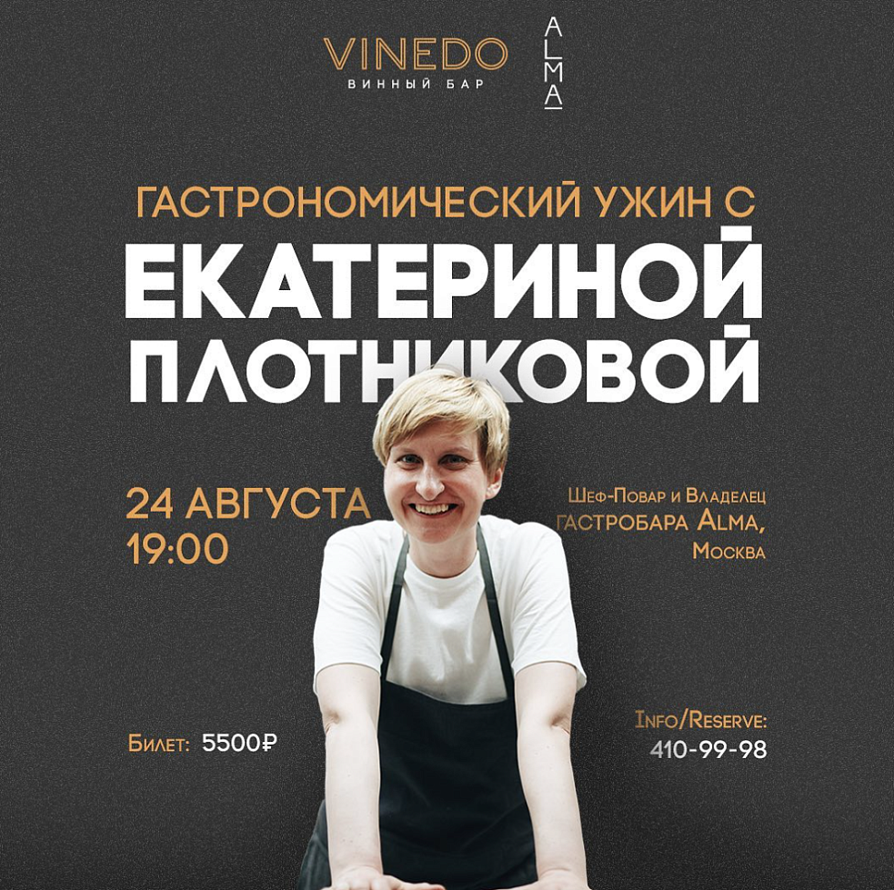 24 августа в 19:00 в винном баре Vinedo состоятся гастроли Екатерины Плотниковой, шеф-повара и владельца гастробара Alma, Москва.