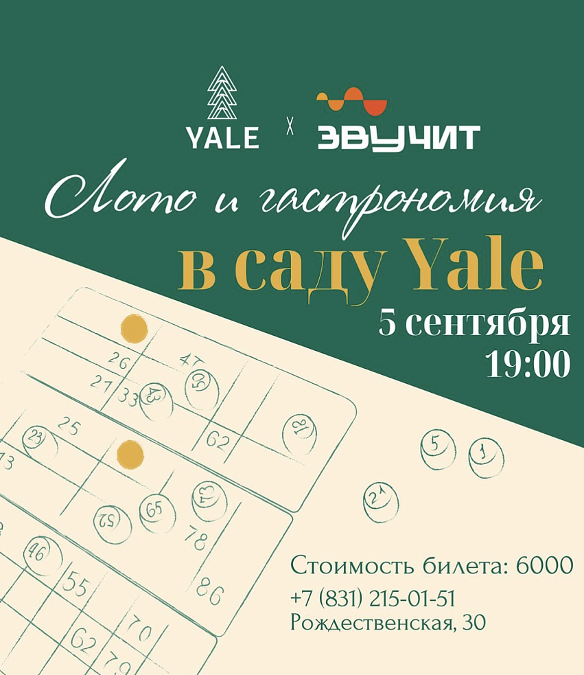Ужин в летнем саду ресторана YALE «Гастрономия и лото» 5 сентября в 19:00