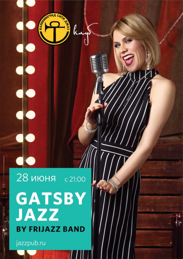 Frijazz band приглашает вас в пятницу, 28 июня 2019 года на вечеринку Gatsby jazz в Клуб Калининград Сити Джаз. Вы с головой окунетесь в атмосферу гламура, безудержного веселья, романтики и беспечности времен «ревущего джаза». Добавьте немного популярной в те годы «шипучки» и вот вы уже на пороге роскошной гостиной Гэтсби. В этот вечер Вас ждёт одно из самых увлекательных джаз-путешествий во времени!