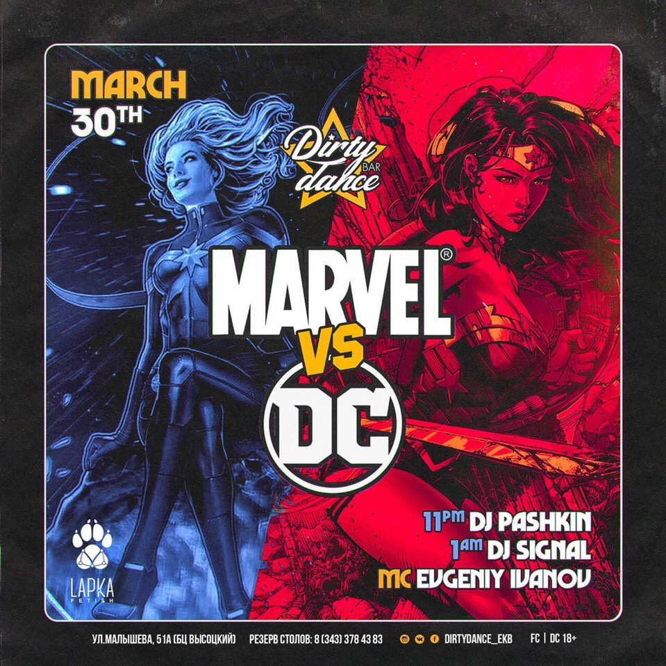 30 марта, в субботу, в самом танцевальном баре Екатеринбурга ты сможешь увидеть, как Женщина-Кошка танцует на шесте, Железный Человек и Человек Паук пьют наперегонки с Гаморой и Грутом????, а Дедпул и Доктор Манхэттен зарядят ночь качественным саундом за пультом