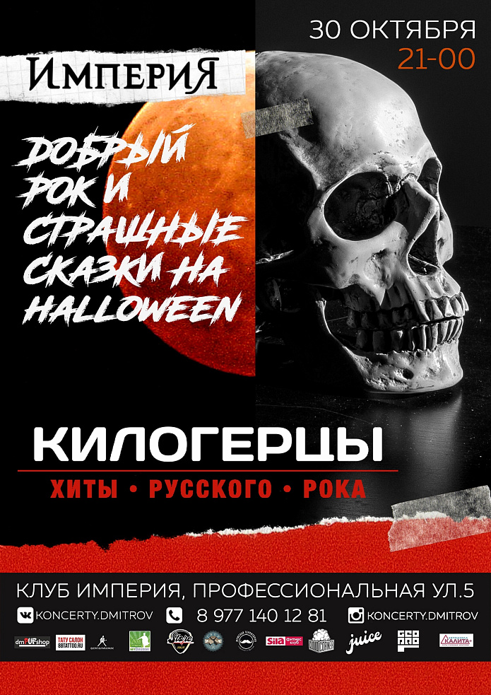 30 октября, в 21-00 Клубе ИМПЕРИЯ мы встретим самую жуткую ночь года в стиле Хелувин по-русски! "Добрый рок и страшные скази" - специальная программа от группы КИЛОГЕРЦЫ, которые исполнят шлягеров поп- и рок- музыки с тёмной хелувинской тематикой, сыграют много Короля и Шута, Сетора Газа и групп, кто не обходил стороной потустороннюю тематику<img class="emoji" src="/emoji/e/f09f91bb.png" alt="