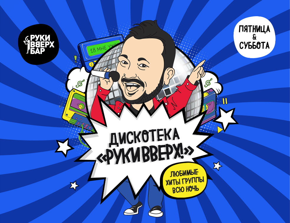 Любишь Руки ВВерх!? Помнишь наизусть горячие хиты? Готов зажигать всю ночь под “Крошку Мою” и “Студента” и спеть их в караоке? Ждём каждую пятницу и субботу в новом Руки ВВерх! Бар на Московском 111. Песни любимой группы каждые полчаса, флешмобы на танцполе.