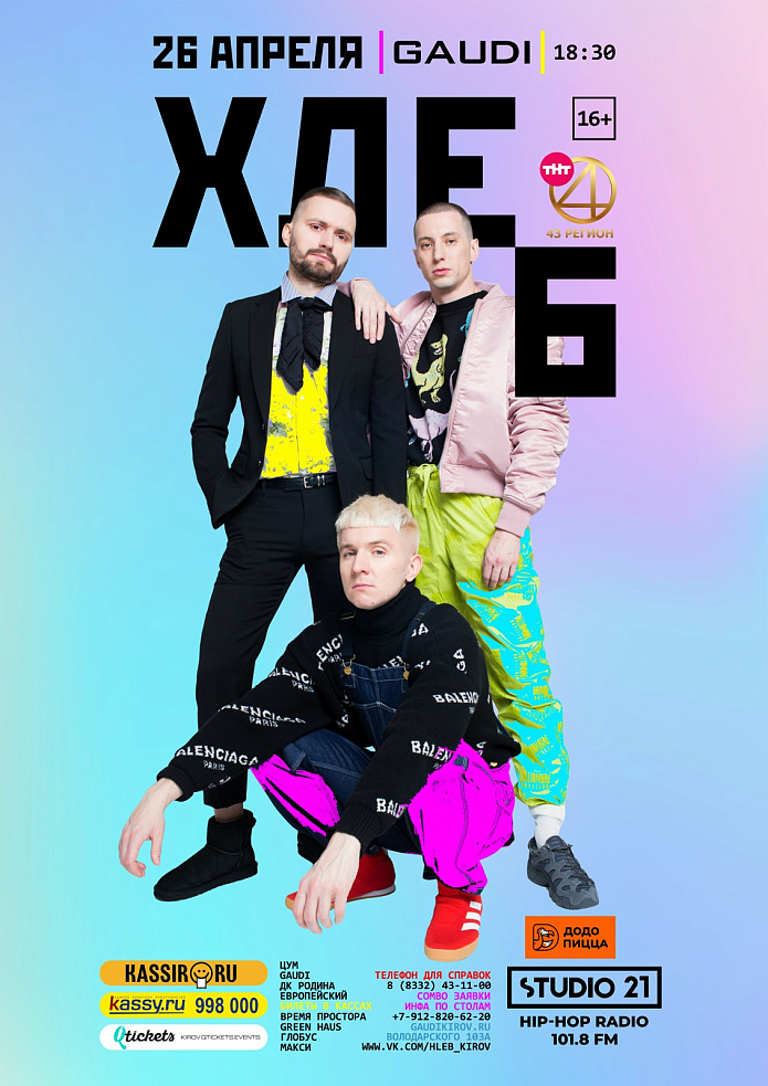 «ХЛЕБ» – уникальный коллектив, который прошёл свой творческий путь от студенческого блога в Интернете до sold out’ов на самых крупных площадках столицы (Adrenaline Stadium, A2 Green Concert, ГЛАВCLUB GREEN CONCERT, Aurora Concert Hall).