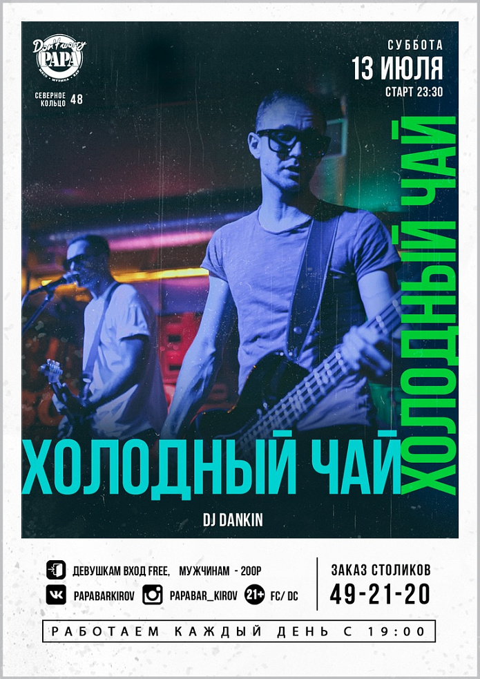 В 23:00 располагаемся поближе к сцене и начинаем отжигать как в последний раз с ослепительными музыкантами из группы "Холодный чай"!