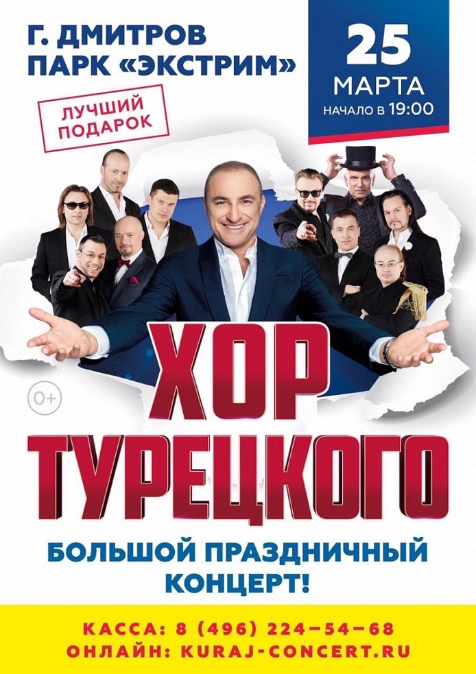 Большой праздничный концерт «Хора Турецкого» 25 марта в Парке «Экстрим» МУ СК «Дмитров» начало в 19:00.