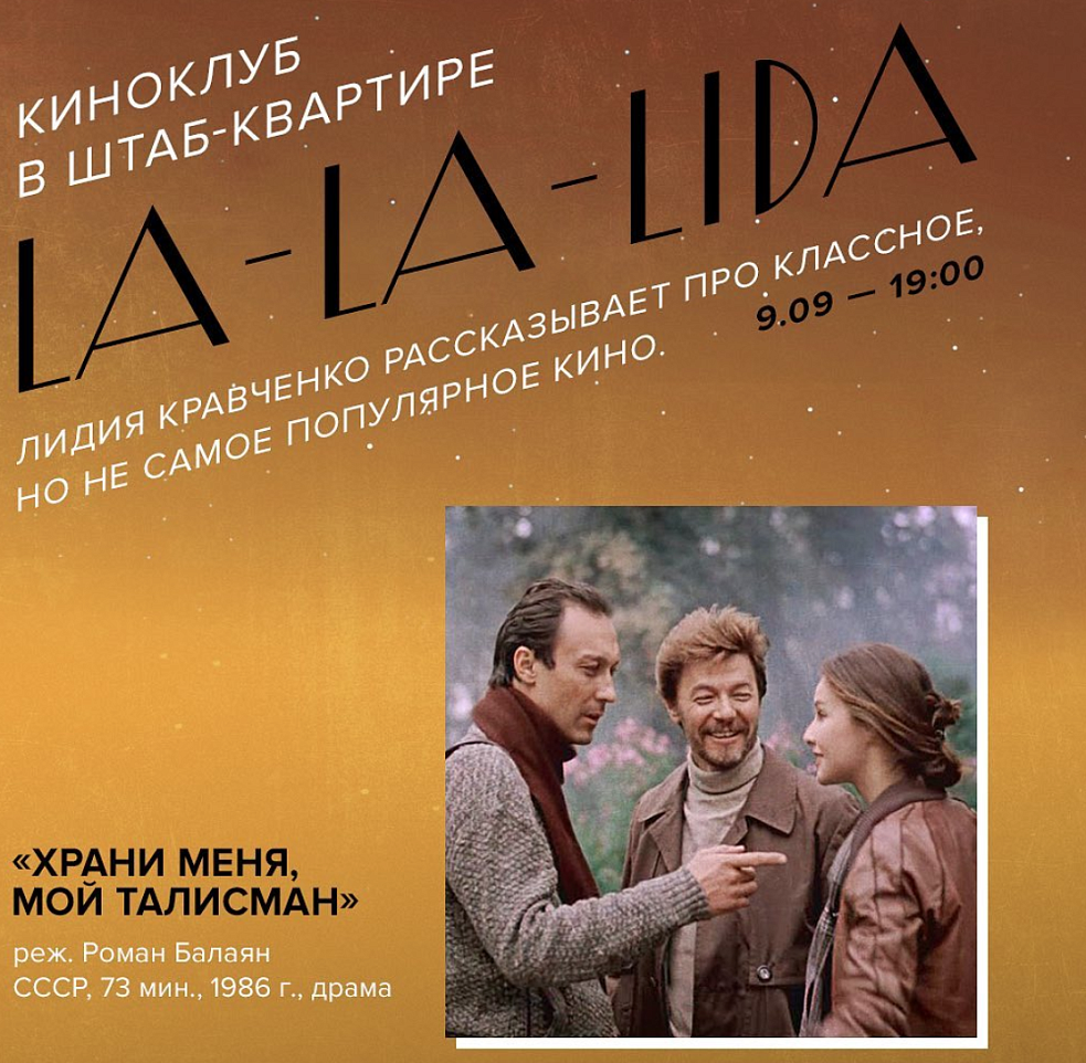 В сентябрьском киноклубе соведущая подкаста «Партнёрский материал» Лида Кравченко показывает лучшее осеннее кино - драму Романа Балаяна «Храни меня, мой талисман». Болдино, Пушкин, золотая осень, Абдулов пытается отбить Друбич у Янковского, все в классных свитерах, вокруг телевизионные съемки и дуэли. Непринятый в 80-х, сегодня этот фильм кажется одним из лучших способов говорить не только о любви, но и о самом Пушкине - без подобострастия, но с огромной нежностью.
