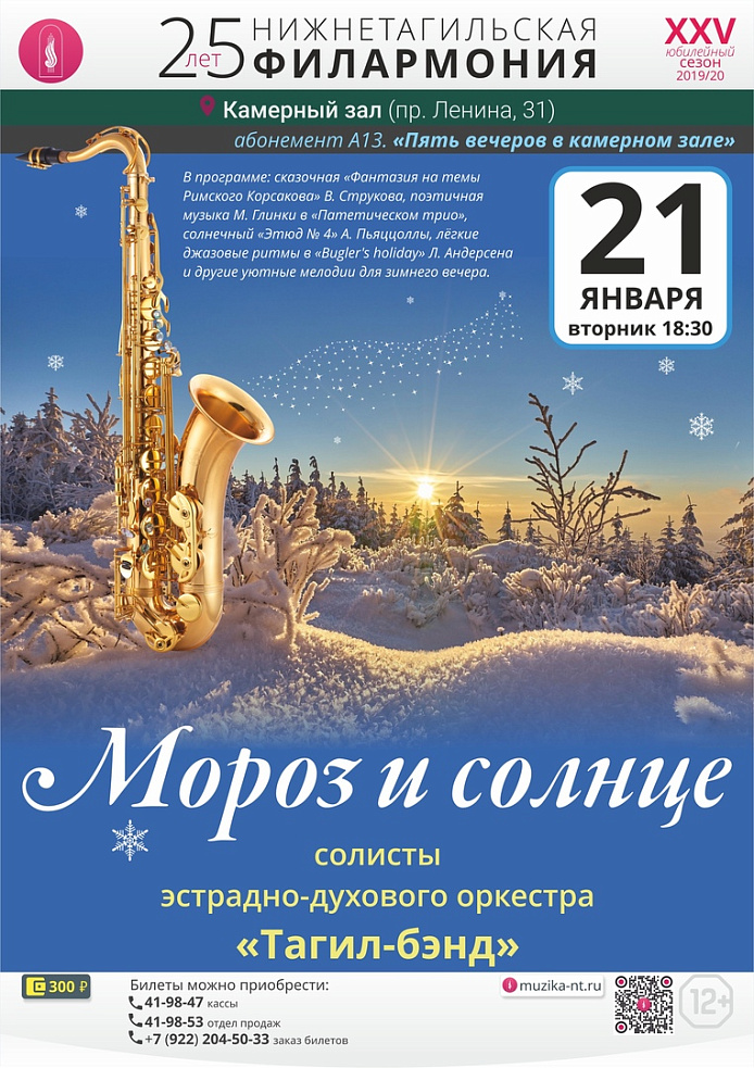 21 января приглашаем любителей камерной музыки на уютный вечер в компании артистов духового оркестра «Тагил-бэнд». В составе небольших ансамблей и соло музыканты покажут, что инструменты, рождённые для «форте» и «фортиссимо», могут звучать совершенно по-разному: нежно, игриво, чувственно, иронично, торжественно.