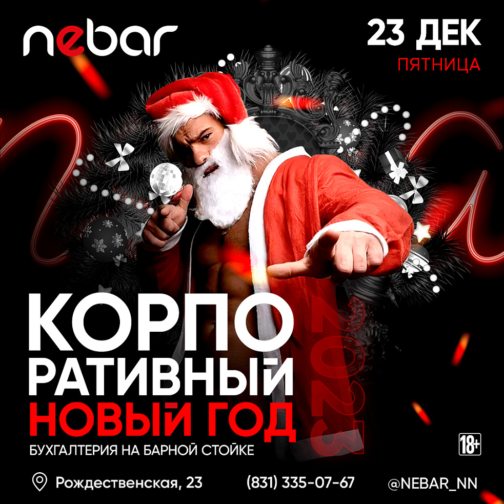 Кто празднику рад, тот накануне пьян! Проведи незабываемый новогодний корпоратив с коллегами в Nebar. В эту ночь тебе обеспечены танцы на легендарной барной стойке, большое количество крутых конкурсов и подарков от безбашенно веселых ведущих ночи, фотограф, который поймает вас в свой объектив! Живой вокал с танцевальными хитами, лучшие резиденты и Дед мороз.