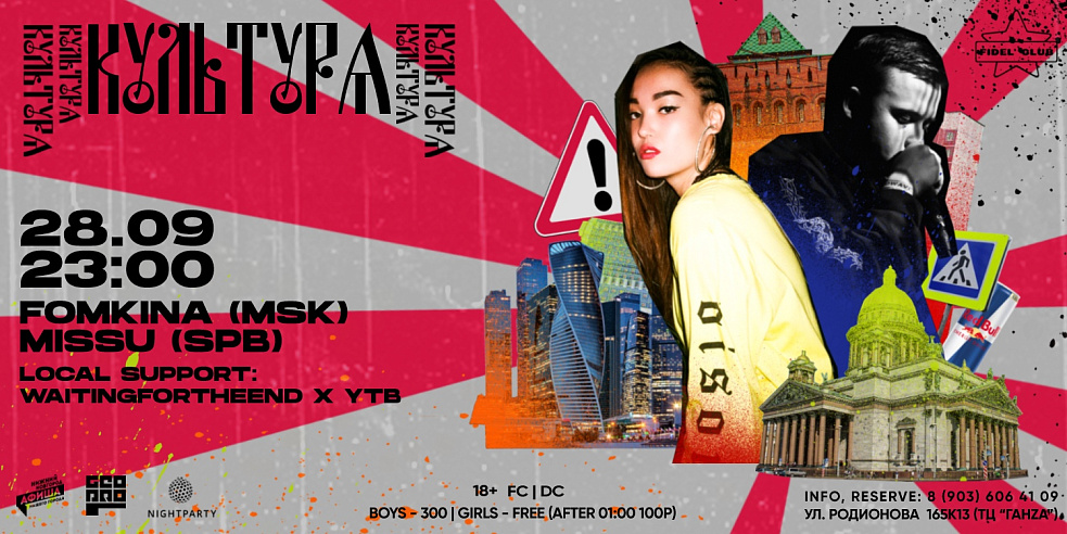 В этот день ты послушаешь только качественную музыку в рамках проекта КУЛЬТУРА. Представлять Москву будет резидент серии вечеринок RE:FLEX и по совместительству мамасита рнб Rita Fomkina. Гостем с Питера станет, недавно дропнувший альбом, музыкант и саунд-продюсер MISSU