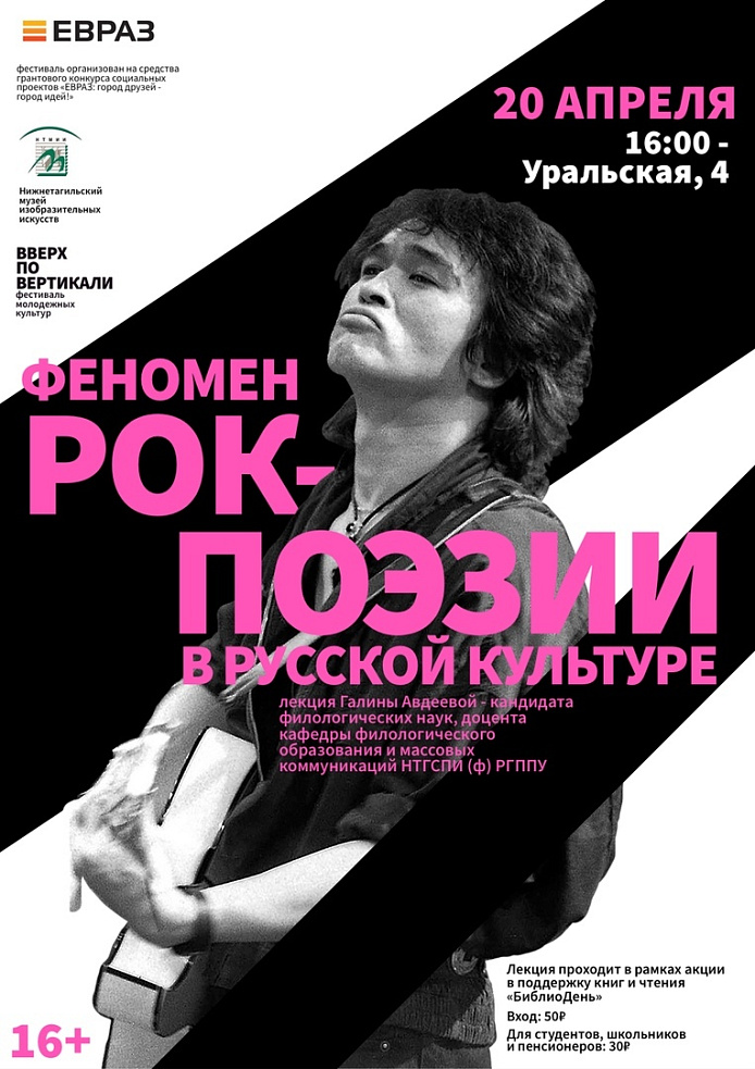 20 апреля (суббота) в 16.00 приглашаем на лекцию «Феномен рок-поэзии в русской культуре» (16+). Лекцию проведет Галина Анатольевна Авдеева – кандидат филологических наук, доцент кафедры филологического образования и массовых коммуникаций НТГСПИ (ф) РГППУ. Место проведения – Нижнетагильский музей изобразительных искусств (Уральская 4).