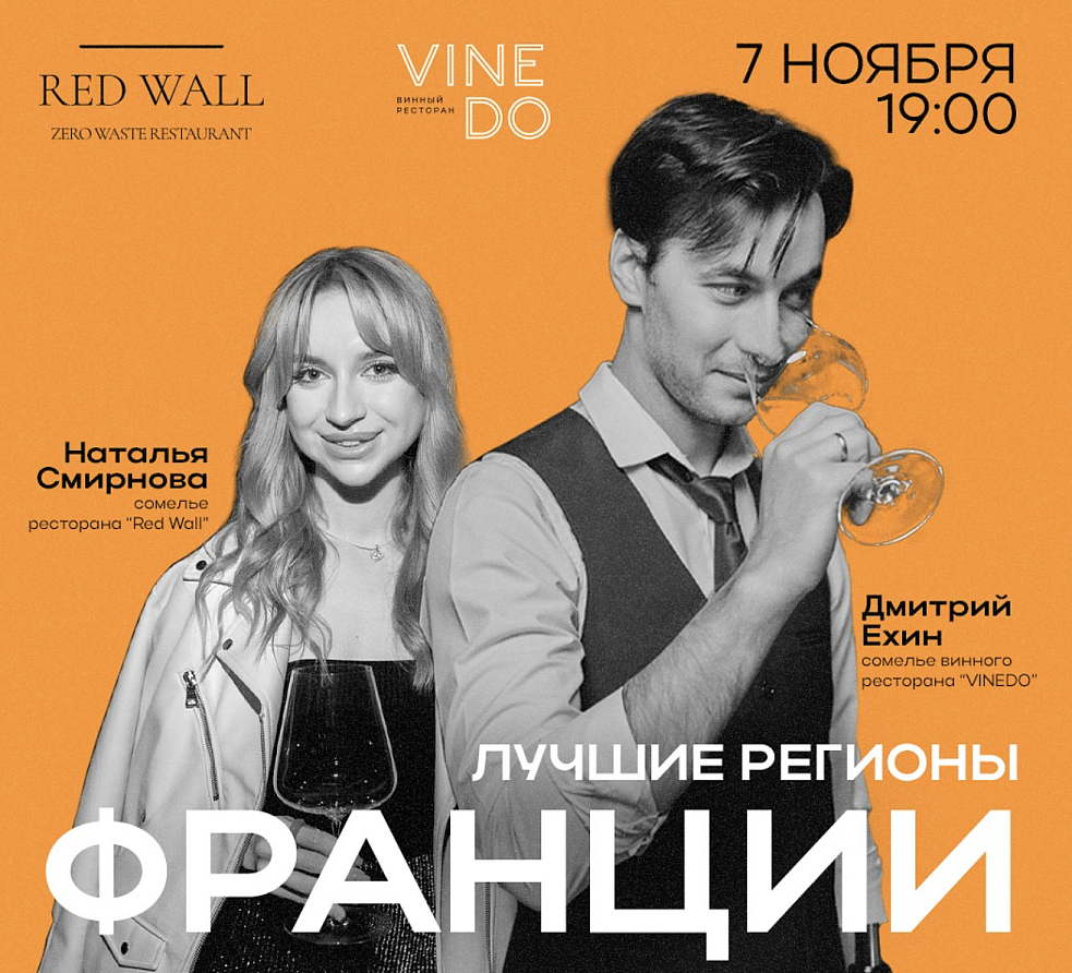 Погрузитесь в мир французского вина на эксклюзивной дегустации, где с вами будут сомелье двух известных ресторанов Нижнего Новгорода— Дмитрий Ехин из винного ресторана Vinedo и Наталья Смирнова из ресторана Red Wall.