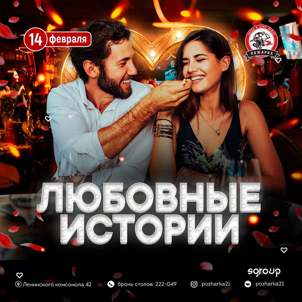 В честь дня всех влюбленных мы объявляем конкурс на самую романтичную историю любви связанную с баром Пожарка и подарим победителю сертификат на 3000р, а так же всем участникам вкусные утешительные призы.