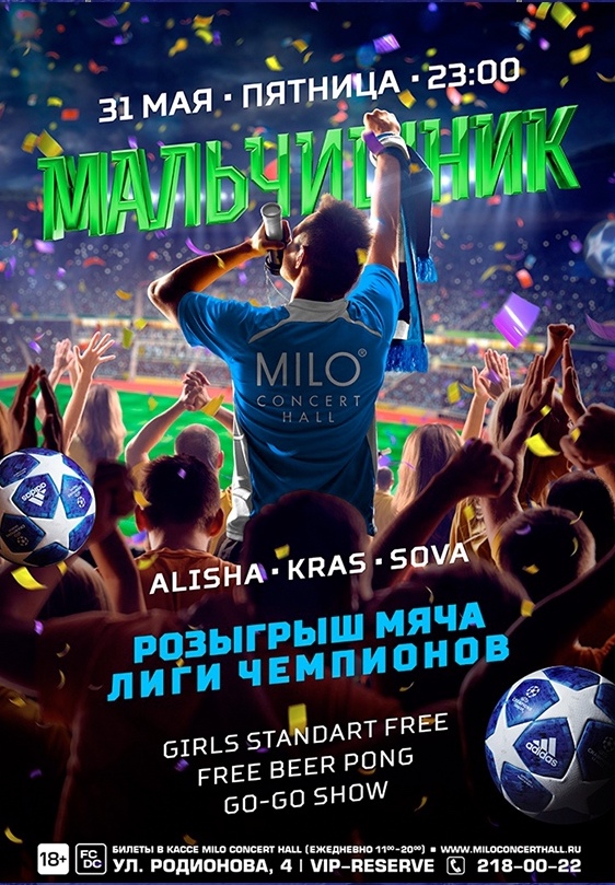 31 мая в MILO CONCERT HALL вечеринка проекта МАЛЬЧИШНИК вновь собирает своих людей! Приходи с своей командой в полном составе. Никаких замен и дозаявок.