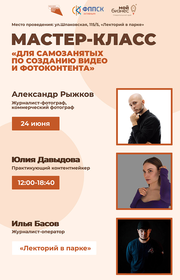 Центр «Мой Бизнес» Ставропольского края, действующий на базе некоммерческой организации «Фонд поддержки предпринимательства в Ставропольском крае», приглашает самозанятых граждан принять участие в мастер-классе по теме: «Мастер-класс для самозанятых по созданию видео и фотоконтента»