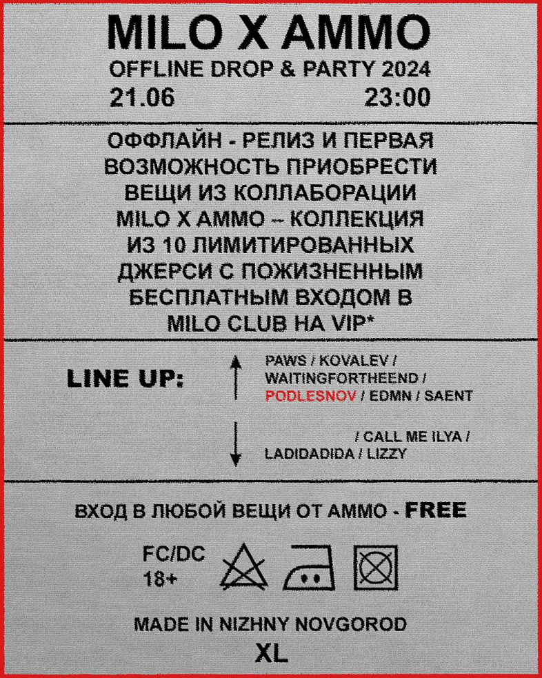 21 июня - на вечеринке от ammo отмечаем оффлайн-релиз и первую возможность приобрести вещи из коллаборации milo x ammo – коллекция из 10 лимитированных джерси с пожизненным бесплатным входом в milo club на VIP*. Обладателям самых стильных луков на мероприятии выборочно подарим вещи ammo.wrld и сертификаты от партнеров - anderstore firework.custom.