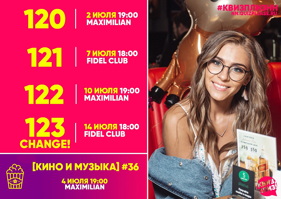 Сверим часы и наши планы на грядущие дни. Квиз, плиз! #120 сообразим в Максимилиане 2 июля, устроим слет кино- и меломанов 4 июля, а на классику под номером 121 дружно соберемся в Фиделе 7 июля.