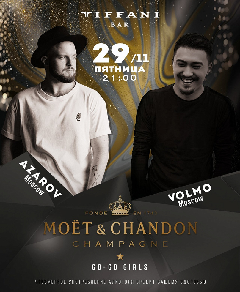 В эту ночь, в Тиффани полностью Московский состав диджеев : Dj Volmo во главе с легендарным Dj Azarov много разной музыки, много Moët & Chandon ещё больше танцев..