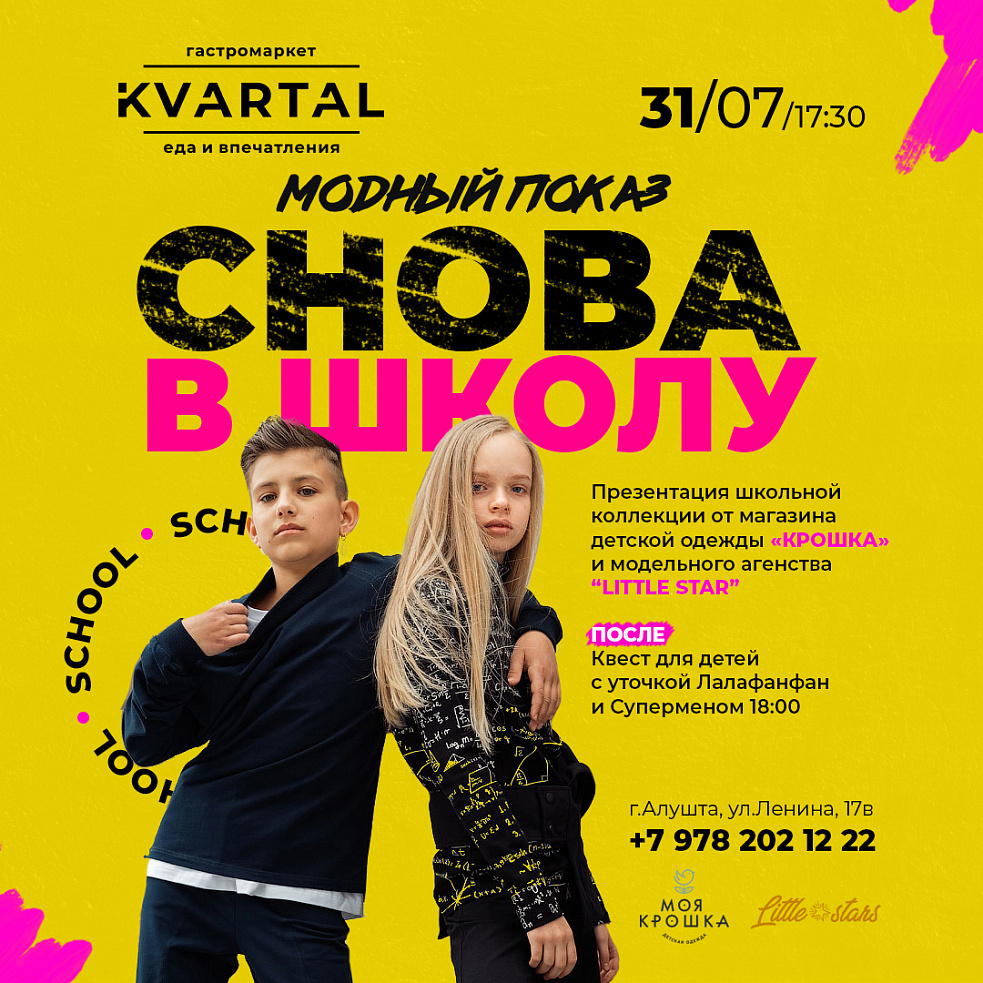31 июля на лучшей шоу-площадке города @gastromarket_kvartal пройдёт презентация школьной коллекции от магазина детской одежды «КРОШКА» совместно с модельным агенством @little_star