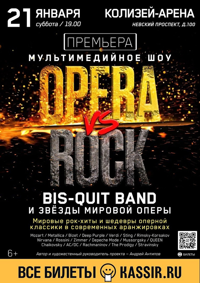 Лучшая crossover-группа по версии «NCA MUSIC AWARDS» – BIS-QUIT BAND представляет своё самое яркое и знаменитое во всем мире мультимедийное шоу «OPERA vs ROCK» с участием солистов Мариинского театра и звёзд мировой оперы: Ольга Пудова (сопрано), Дмитрий Григорьев (бас), Ирина Шишкова (меццо-сопрано), Борис Степанов (тенор), Екатерина Сергеева (меццо-сопрано), Юлия Сулейманова (сопрано), ставшее масштабным продолжением мультимедийного проекта «OPERA A LA RUSSE».