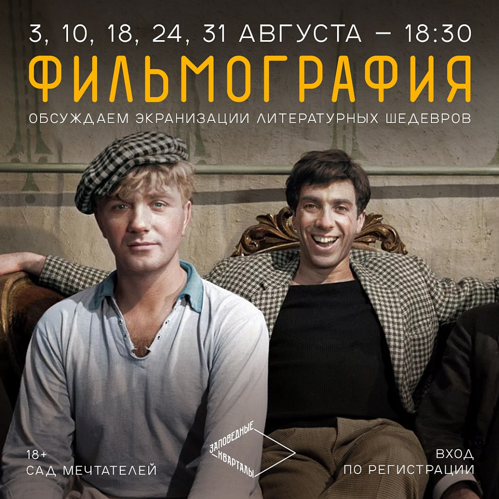 «Заповедные кварталы» открывают цикл встреч кинокнижного клуба. С 3 августа и до конца лета в Саду мечтателей, в рамках проекта «Фильмография», будут проходить встречи, где вы сможете обсудить сходства и различия между литературными произведениями и их киноверсиями.