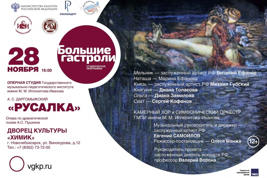 28 ноября на сцене Дворца культуры «Химик» состоятся Большие гастроли с оперой по драматической поэме А. С. Пушкина «Русалка» в исполнении настоящих звёзд академической сцены – студентов Государственного музыкально-педагогического института имени М.М. Ипполитова-Иванова.