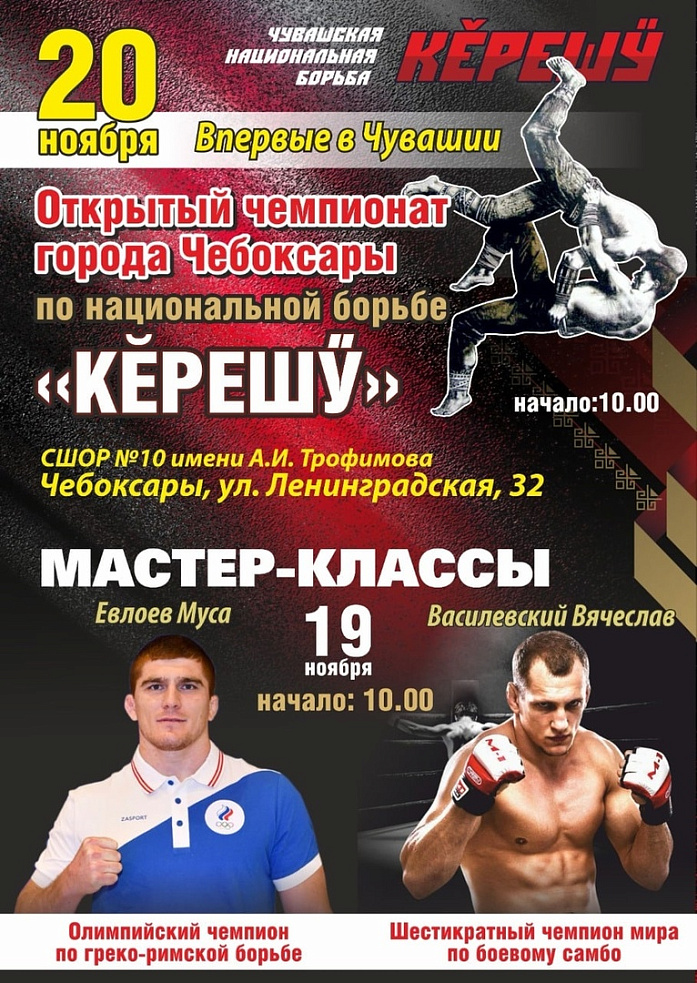 19 ноября, в Чувашии мастер-классы и открытые тренировки проведут олимпийский чемпион по греко-римской борьбе, двукратный чемпион мира, Заслуженный мастер спорта России Муса Евлоев и шестикратный чемпион мира по боевому самбо, двукратный чемпион Европы, Заслуженный мастер спорта России по боевому самбо Вячеслав Василевский.