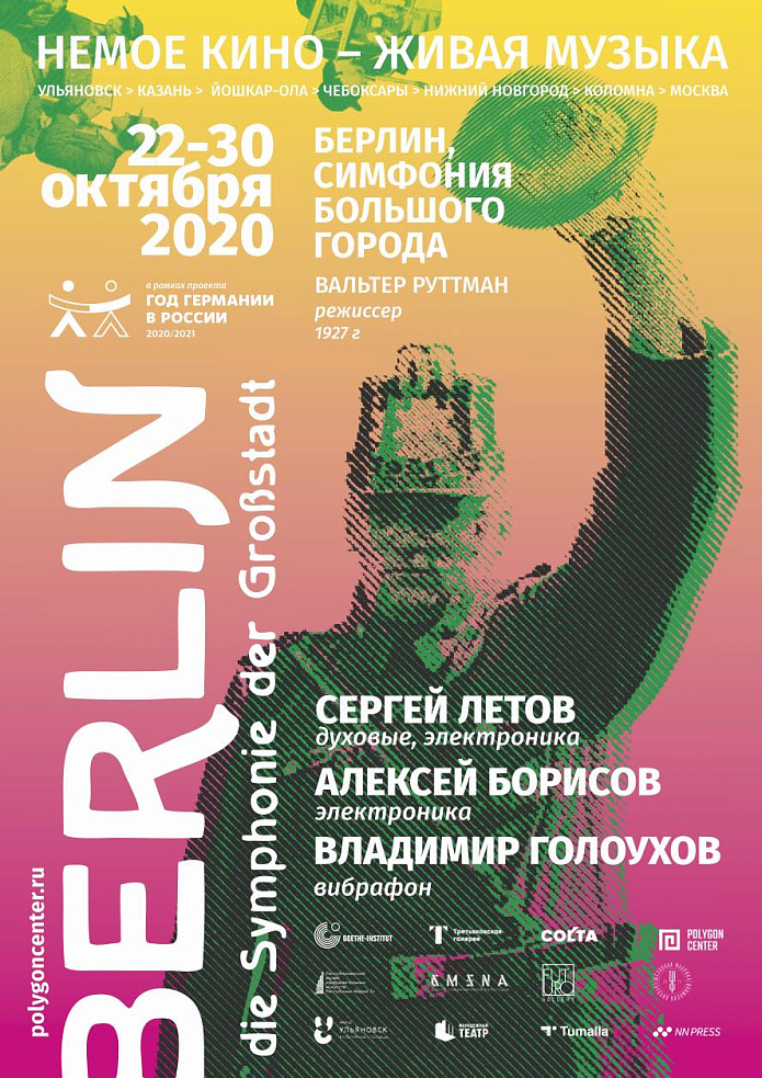 Организатор проекта Фонд регионального развития «Содружество» при поддержке Гёте-Института в Москве и культурных институций Ульяновска, Йошкар-Олы, Казани, Чебоксар, Нижнего Новгорода, Коломны и Москвы представит жителям этих городов уникальную возможность стать частью лайф- кросс-культурной симфонии, стирающей границы времени и пространства, ритма и звука. Живой мультимедийный образ города 20-х годов прошлого века создадут известные музыканты: вибрафонист и композитор Владимир Голоухов, мультиинструменталист Сергей Летов, саунд-артист Алексей Борисов, а также жители Берлина прошлого века – немые статисты фильма-хроники Вальтера Руттмана «Берлин, симфония большого города».