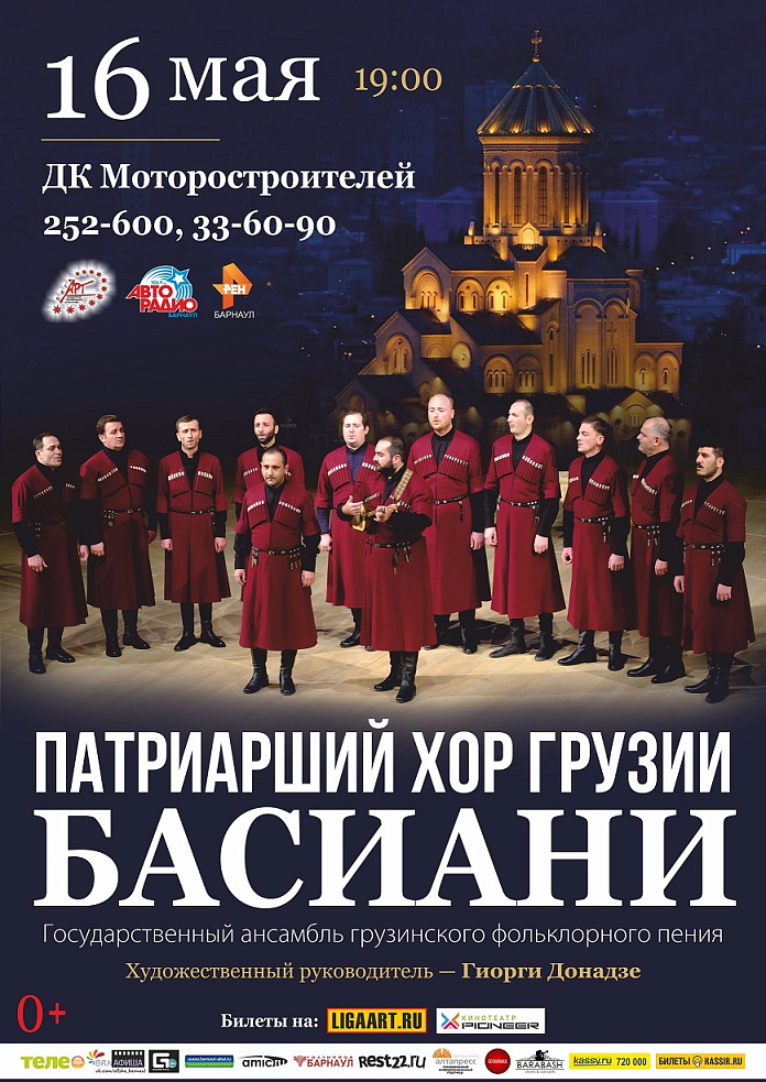 16 мая 2019 года, на сцене ДК Моторостроителей города Барнаула с большим сольным концертом выступит Патриарший хор Грузии БАСИАНИ. Солисты хора - молодые певцы из традиционных певческих династий, которые начинали свой творческий путь в местных детских фольклорных коллективах.