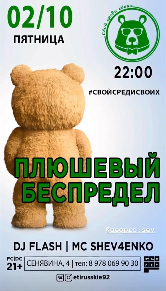 2 октября в 22:00 вечеринка «Плюшевый беспредел» в баре «Эти русские»! Гостей ждут выступления от DJ FLASH и MC SHEV4ENKO. Приходите за своей порцией хорошего настроения!