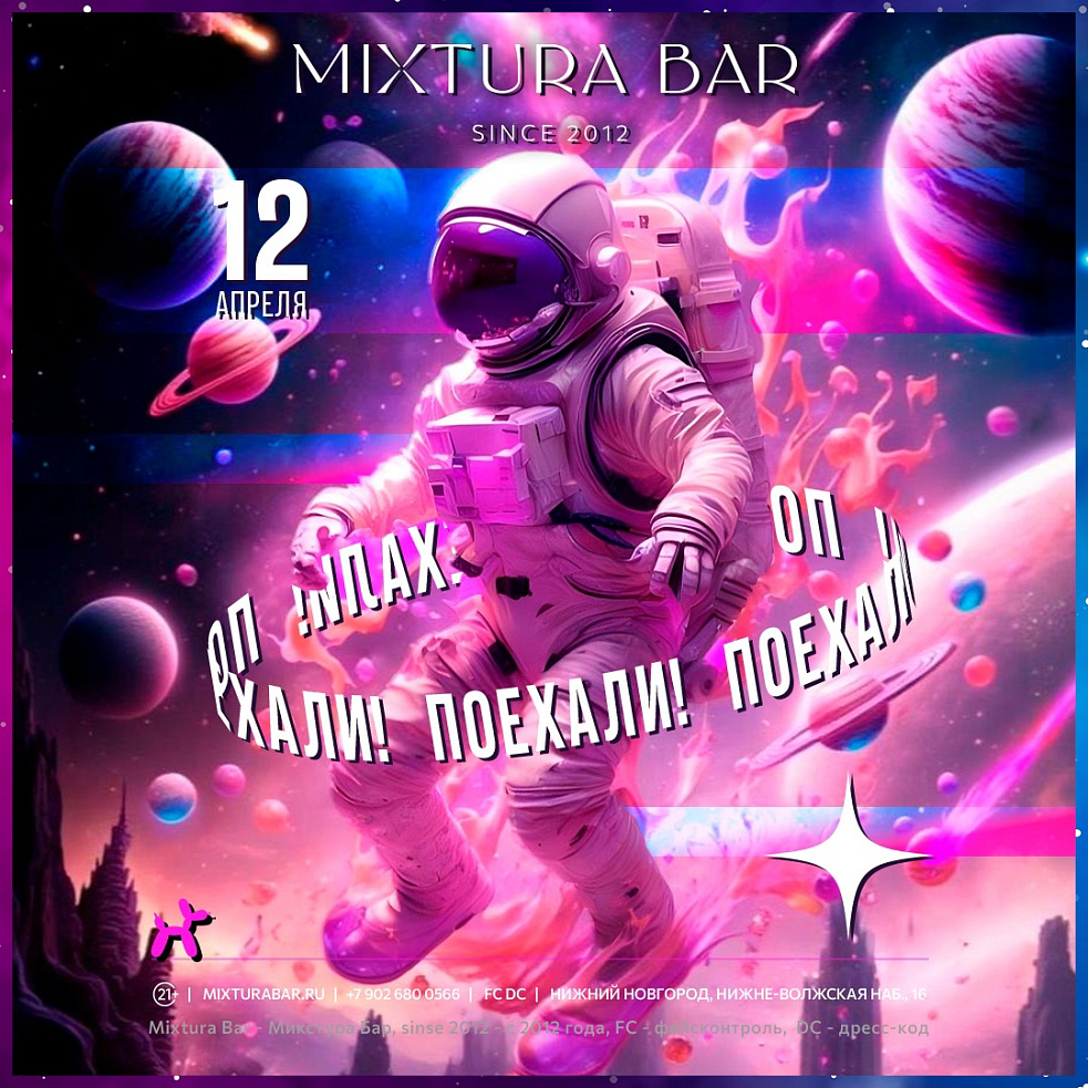 В субботу отмечаем исполнение невероятной мечты первого человека, полетевшего в космос! Нас ждут звезды и млечный путь, новые галактики и черные дыры. Отправляемся в звездное путешествие на вечеринке "Поехали!" с космической станции "Микстура".