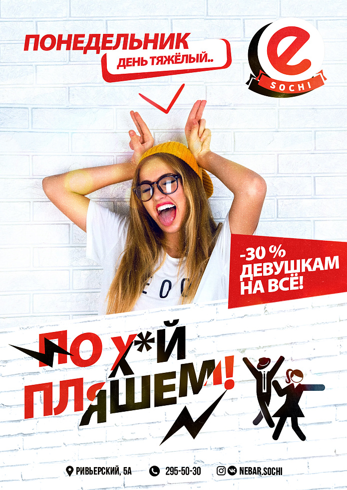 Понедельник день тяжелый?! ПОХ*УЙ ПЛЯШЕМ, заявляем мы смело, твердо и глубоко.... Небар любит своих гостей, особенно по понедельникам, особенно красивых девочек ! Именно по этомк ПОПАнедельникам 30 % скидка всем девушкам на все меню кухни и бара
