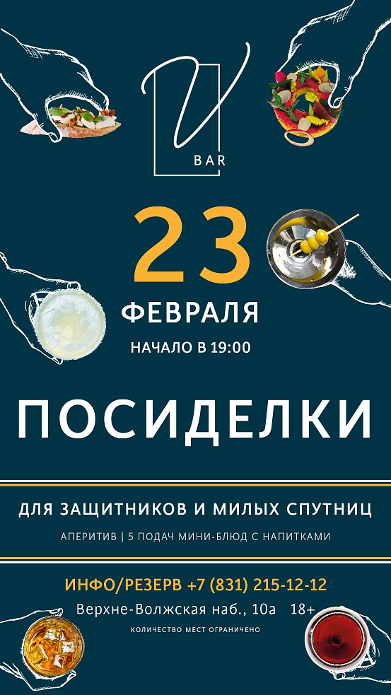 Камерная обстановка V bar, приятные беседы и гастрономическое предложение для защитников и их милых спутниц. Меню состоит из аперитива и 5 курсов мини-блюд в сопровождении напитков, искусно подобранных барменами.