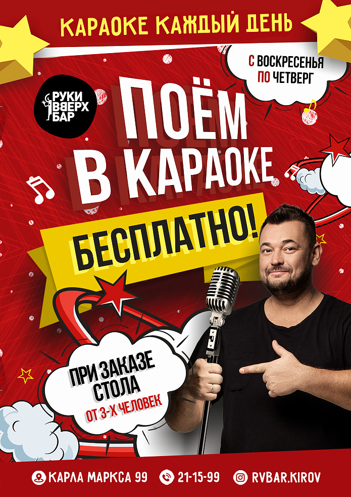 Поём в караоке бесплатно! Бронируй стол в Руки ВВерх Бар на 3 и более человек и пой любимые песни за счет Серёги Жукова.