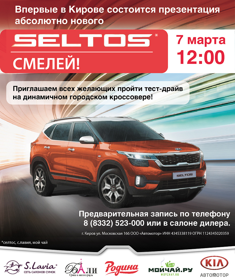 Впервые в Кирове 7 марта в 12 часов состоится презентация нового KIA Seltos.