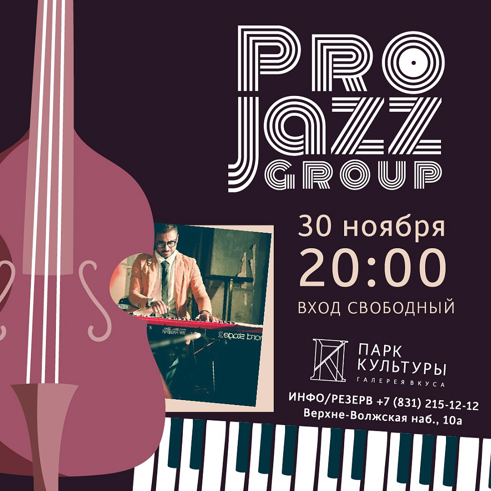 Приглашаем на атмосферный джазовый вечер. Искренность, яркость и изысканность - это все о Pro Jazz. Group, музыканты выступят в эту субботу в составе дуэта (клавиши и контрабас).