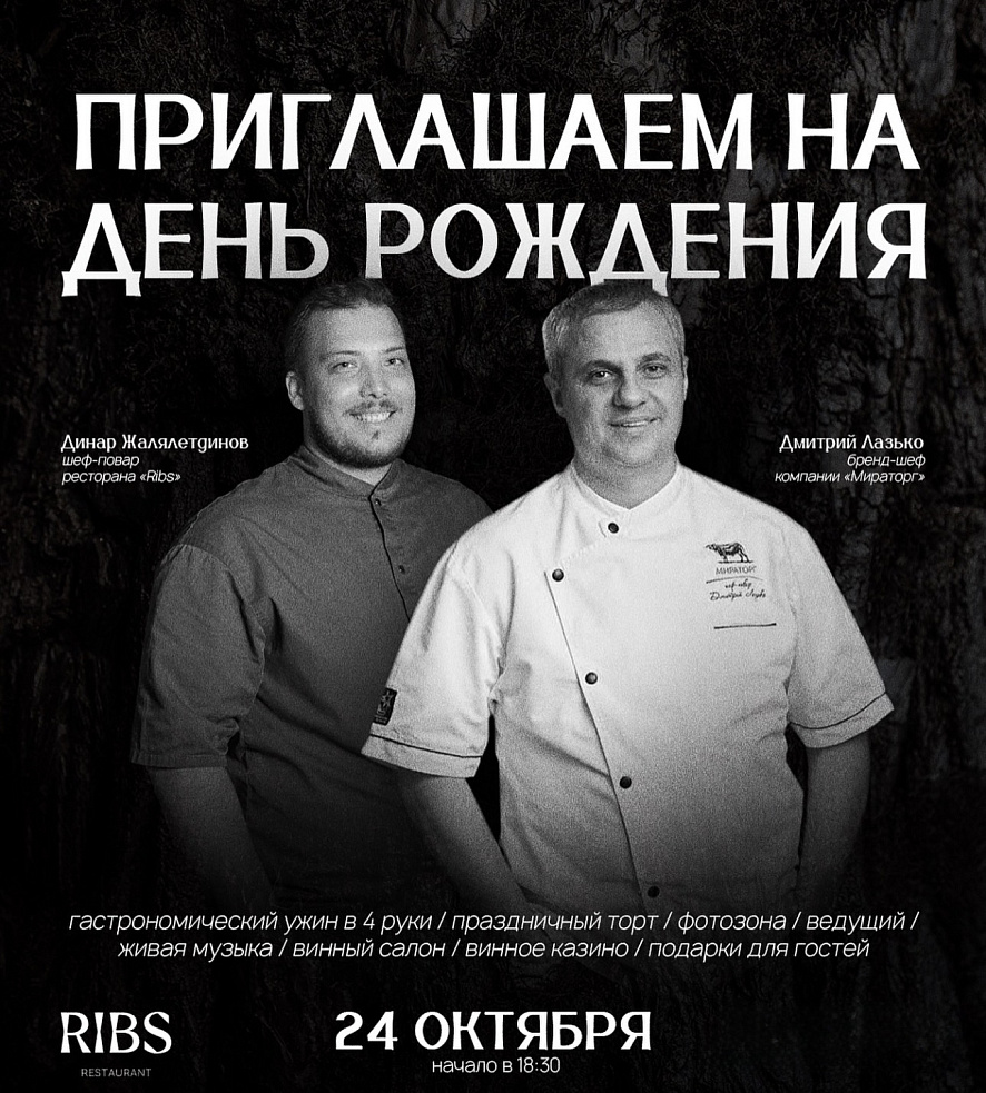 В течение вечера для вас будут готовить шеф-повар ресторана «Ribs» Динар Жалялетдинов и бренд-шеф компании «Мираторг» Дмитрий Лазько.