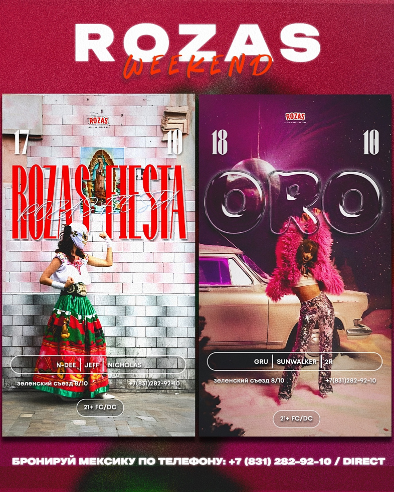 В этот weekend ROZAS — две ночи, два настроения, две причины не сидеть дома. Огненная энергия Латинской Америки в пятницу и золотое сияние хитов 70–90-х в субботу.