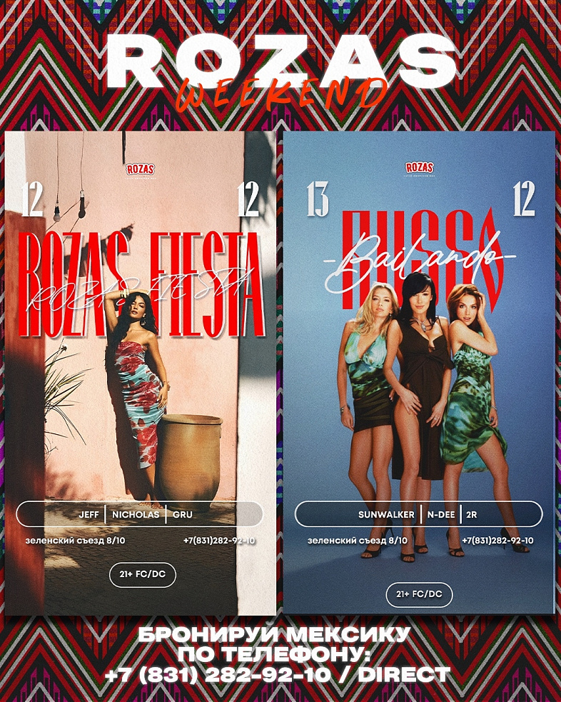После долгой рабочей недели пятница встречает нас латино-американскими ритмами в ROZAS! Viva la fiesta! Текила рекой и раскаленный танцпол! Будет жарко, обещаем!